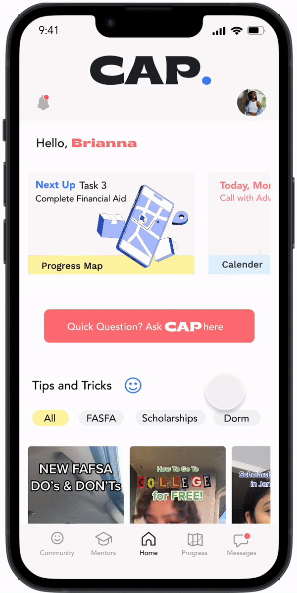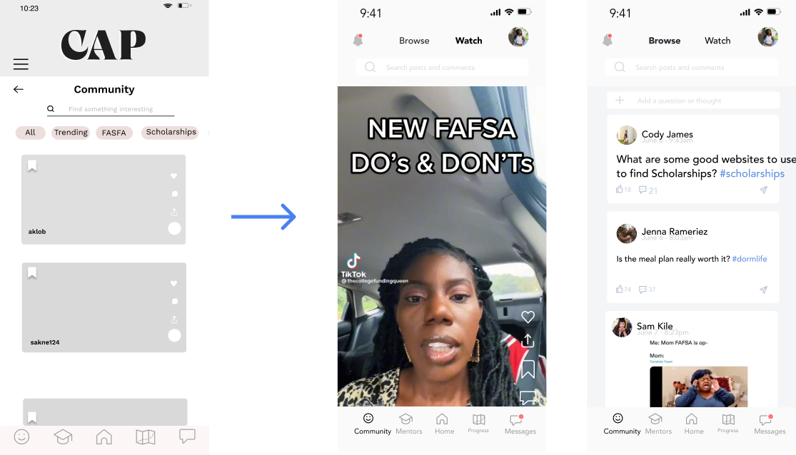 With these insights, we set out to design the College Action Program (CAP) app, focusing on what students truly needed. Minimum Viable Product (MVP) included:
