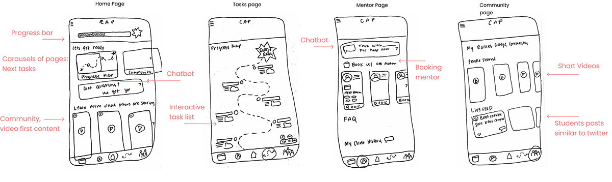 Based on feedback, we made refinements and revisions to the sketches, incorporating additional features and clarifying the user interface. This process of iteration and refinement continued until we arrived at a final set of sketches that accurately captured the company's vision and objectives while also providing an intuitive and engaging user experience. Throughout the process, we remained focused on the user, prioritizing simplicity, ease of use, and clear communication to ensure that the app would meet the needs of students.
